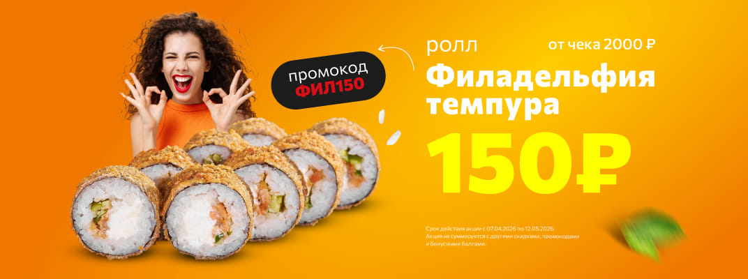 Сделай заказ на 2000 рублей и получи ролл Филадельфия темпура ВСЕГО за 150 рублей.Специальная цена доступна по промокоду: ФИЛ150 (используй его в момент оформления)