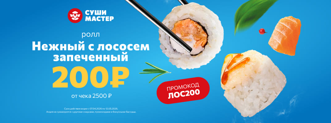 Собери заказ на 2500 рублей и заберите наш хит – запеченный ролл Нежный с лососем ВСЕГО за 200 рублей.Специальная цена доступна по промокоду: ЛОС200 (используй его в момент оформления)